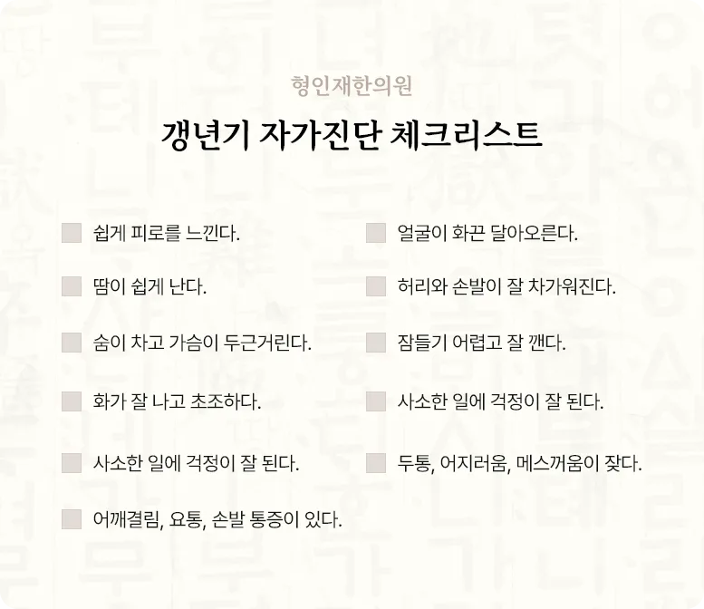 아래 항목 중 3가지 이상에 해당하면 갱년기 증후군을 의심해 볼 수 있습니다.