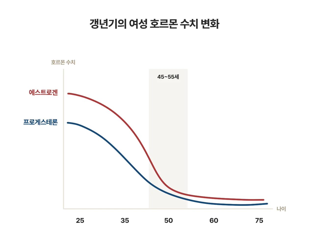 이 시기를 갱년기 또는 폐경기라 하며, 통상적으로 45~55세 정도에 나타납니다.