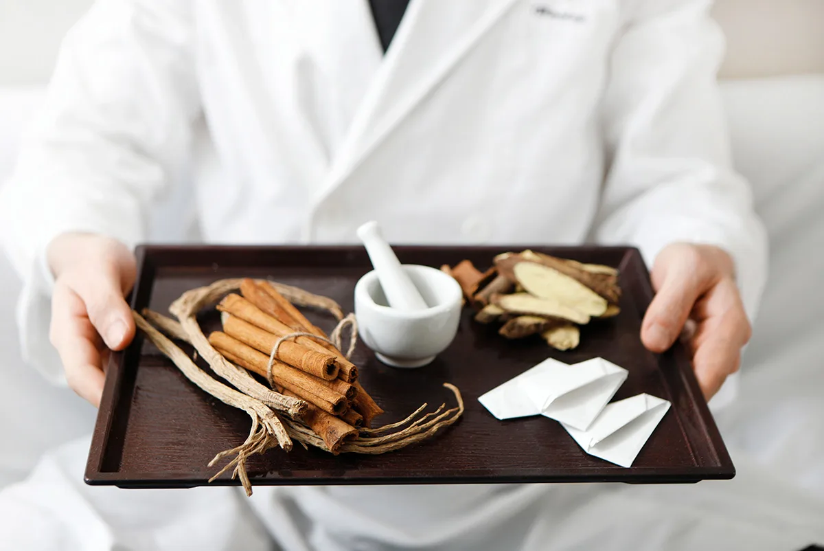 한의사가 한약재 트레이를 들고 있는 모습